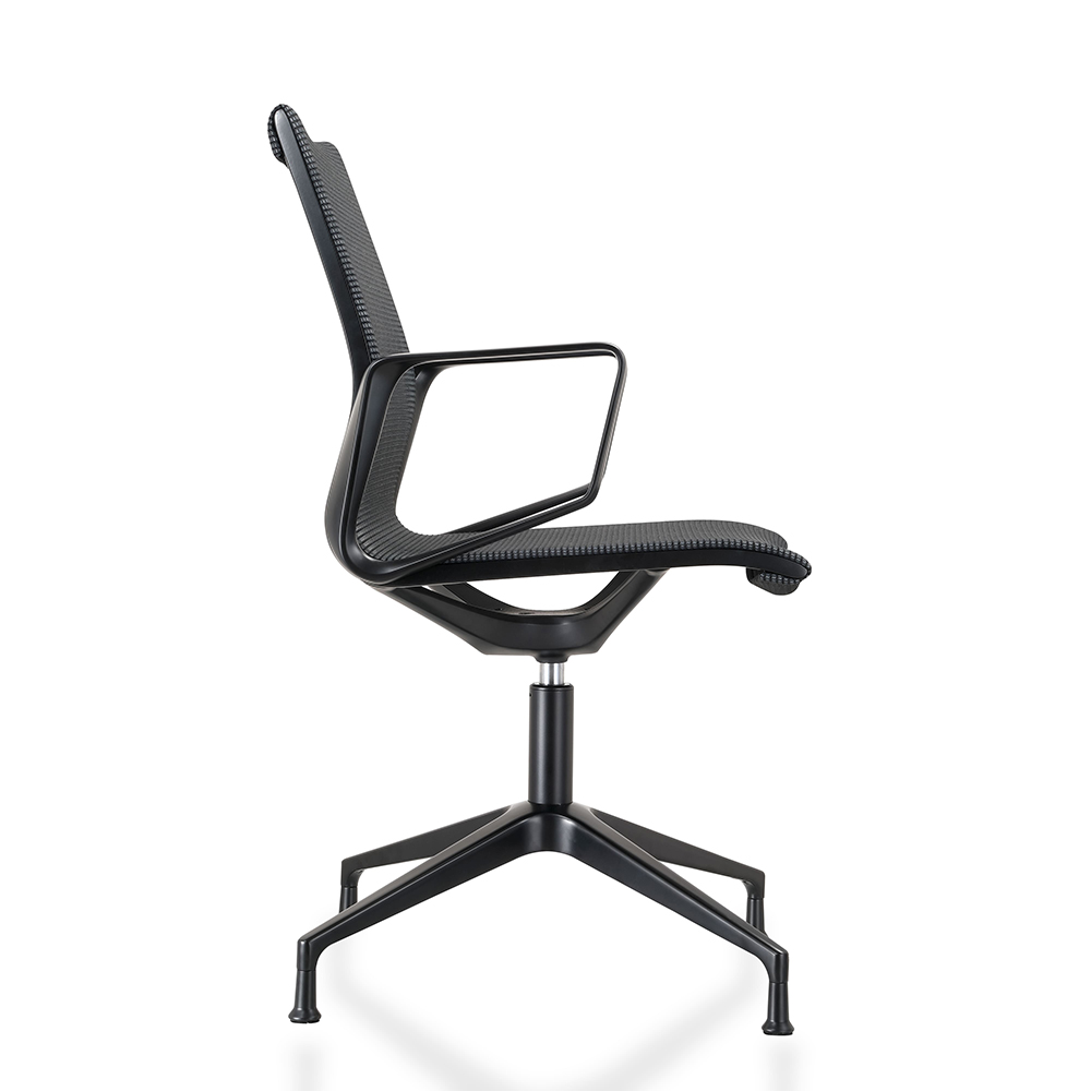 Voro – de design vergaderstoel die modern design combineert met optimaal zitcomfort. Deze vergaderstoel heeft een strakke, stijlvolle look en is bovendien zeer functioneel. De zitting en rugleuning zijn uitgevoerd in een zwart gemêleerde mesh stoffering die zorgt voor een luchtige, comfortabele zit, zelfs tijdens lange vergaderingen. Het aluminium frame, verkrijgbaar in zwart gelakt of gepolijst aluminium, geeft de stoel een verfijnde, professionele uitstraling die in elke moderne vergaderruimte of kantoor tot zijn recht komt. Dankzij het draaibare frame op vaste hoogte ervaar je maximale bewegingsvrijheid zonder aan stabiliteit in te boeten. De vloerdoppen beschermen de vloer en zorgen voor een stabiele, stille zitervaring.